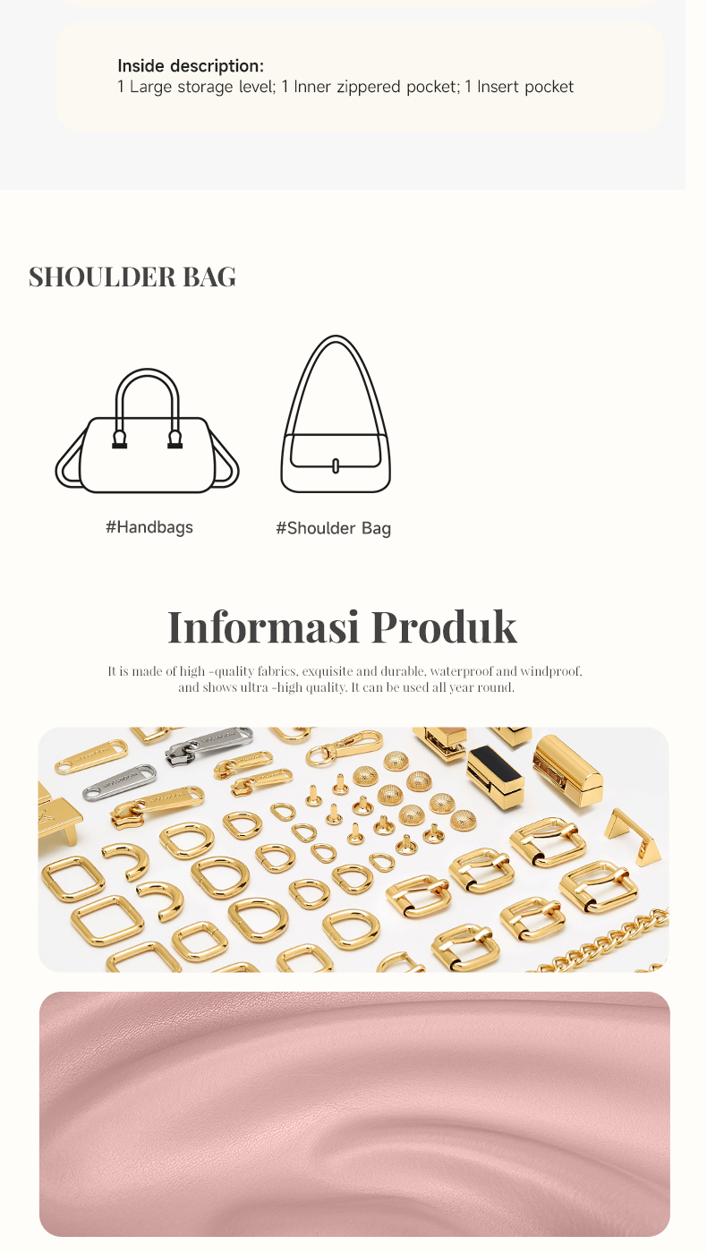 - Struktur internal: saku penyimpanan besar *1 Saku ritsleting*1, saku sisipan * 1,tali bahu dengan tinggi sekitar 55-72 cm (dapat disesuaikan dan dilepas)